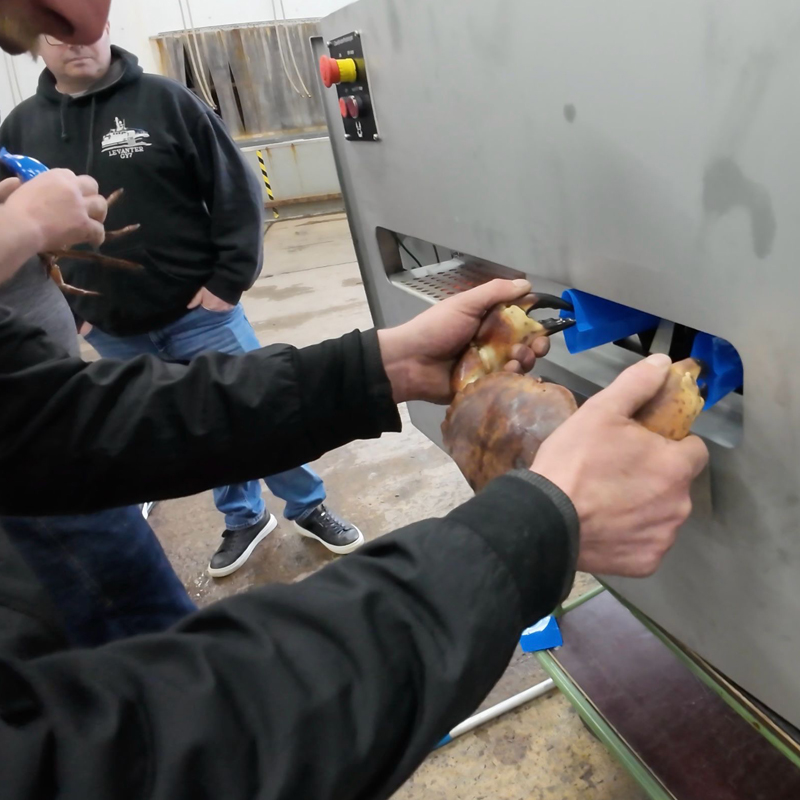 We can wrap all kinds of crustacean and lobster claws, providing them with protection. This unique method keeps the product stronger, extends its lifespan, and reduces stress by 85% compared to traditional claw cutting. The machine processes each crab in just six seconds and wraps two claws simultaneously.